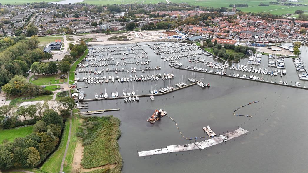 We are making a geotube, a kind of sausage of sturdy water-permeable cloth filled with soil and sludge from the harbour. We are deepening a piece of harbour just north of the Hemmeland-A and that material goes into the tube. Then there will be a border of stones for protection and after a while the breakwater will become overgrown with reeds. A very natural appearance, in line with the banks of the Hemmeland. It will be about 200m long and about 5m wide.
